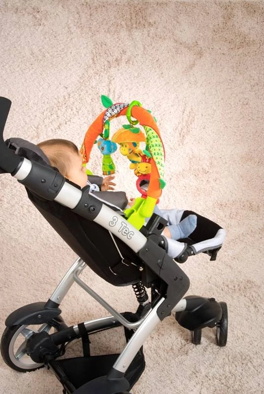 A fixer sur tous les accessoires de bébé (transats, poussettes, nacelles, lits …) * Eveil des sens (toucher, vue, ouïe) : couleurs vives et matières contrastées (papier crépitant, broderies …) * 3 personnages à découvrir avec des fonctions variées (miroir, son du hochet, fonction vibration) * 1 jouet à vibration (singe) avec attache bambou universelle pour suivre bébé dans tous ses déplacements * Arche inclinable * 2 pinces « clip » universelles * les jouets sont détachables